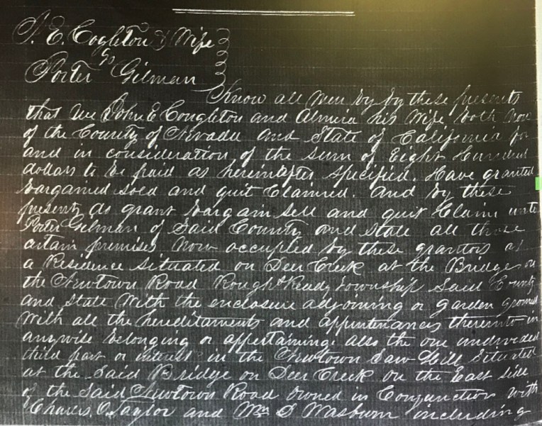 Proceeding with the confidence in my family historian ability to find stuff out and armed with the cryptic notation, I proceeded to the Doris Foley Library in Nevada City, California. I asked the helpful volunteer there if he was familiar with Kitt’s Index. And he responded, “Of course. And we have the original records on microfilm if you would like to see them.” After a short happy dance, I found myself looking at the record of my great great grandparents, John E. and Almira Congleton, selling their property, which included their residence and their one third interest in the “Newtown Sawmill,” to Porter Gilman in 1857 for $800. The description of the property indicated it was located at the bridge on Deer Creek on the East side of the Newtown Road Bridge. Now we were getting somewhere!