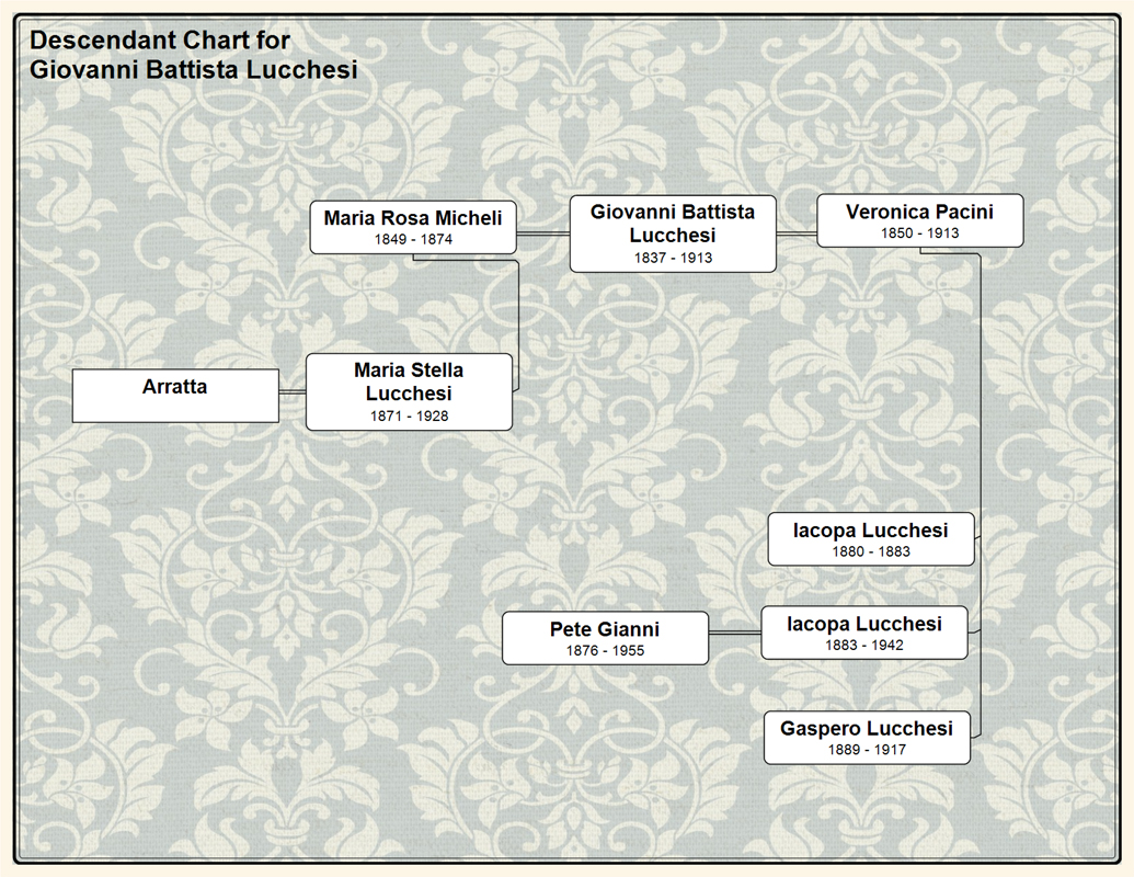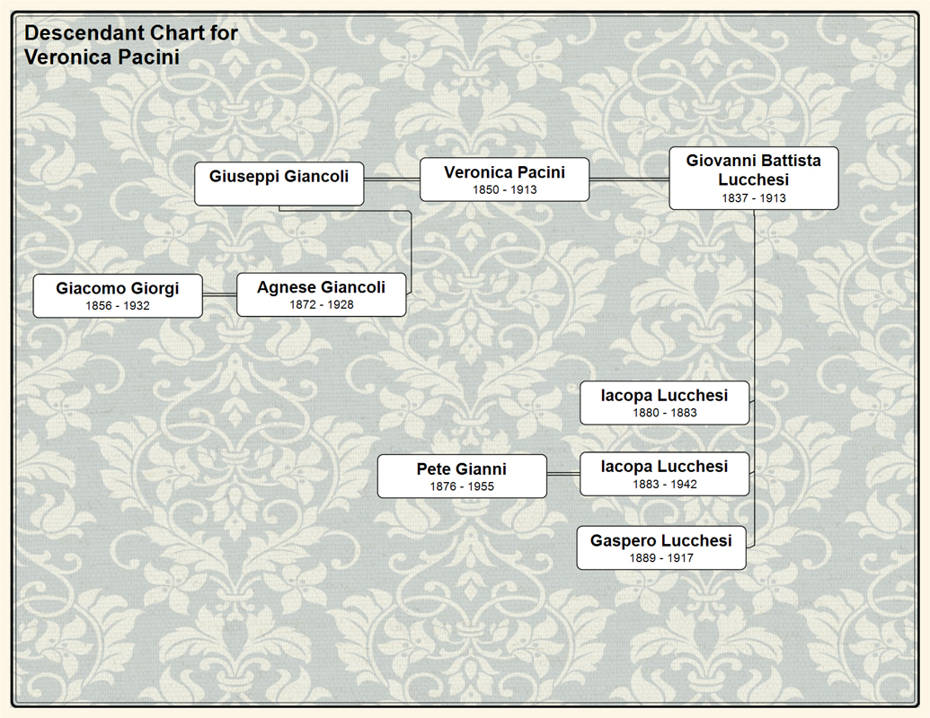 For Giacinto Giorgi’s descendant chart click here or for Veronica Pacini’s click here or for Giovanni’s click here.