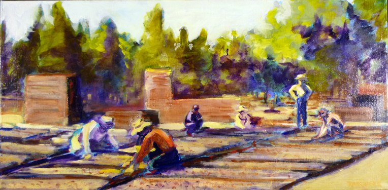 These images document life on the prune ranch, from the trees in different seasons to the workers during harvest. Thanks to Kay Schmidt Robinson for letting me use her photo of the family orchard truck for the painting below.