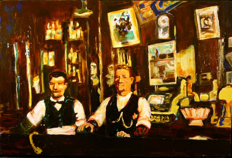 The painting of an airman from World War II is my Uncle Richard Buchignani, who was killed in air raid in the South Pacific. A transfer of an enlarged version of the telegraph announcing he was missing in action makes a somber backdrop for his rakish stance. Other family images include a younger Richard with a Coke bottle, my grandfather Victor Buchignani at the saloon where he worked in the early 20th century, and my cousin Mildred Harris Farrell as a young girl at the Russian River.