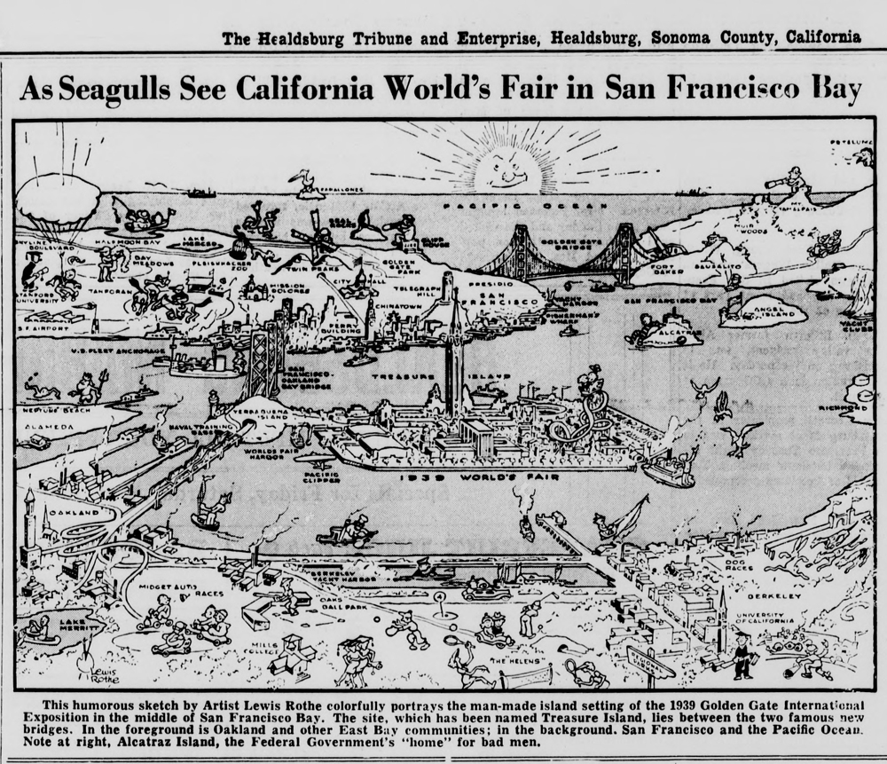 Even as the work was just beginning on the two bridges, the idea of holding a World’s Fair to commemorate their completion was floated in a letter written to The San Francisco News in February 1933. The idea caught on immediately and the debate over location began. Some favored repurposing the Presidio, site of the 1915 Panama-Pacific International Exposition, others preferred Golden Gate Park or Candlestick Point. But ultimately, in 1935 it was decided that a man-made island would be built on the Yerba Buena Shoals to be named “Treasure Island” in honor of the novel by Robert Louis Stevenson, who had lived on Bush Street in San Francisco for a short time.