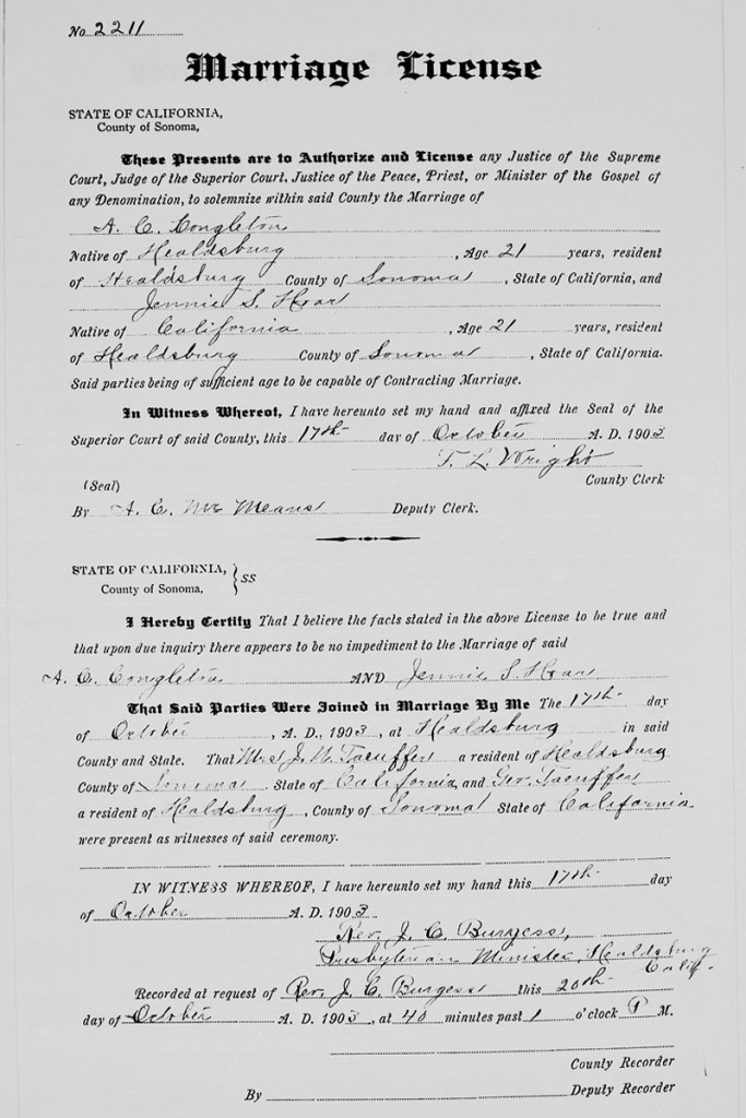 Apparently, life in the big city did not suit Claude as well as he had hoped, and it was not long before he was back living in Healdsburg. On October 17, 1902 not two months before his 22nd birthday A. Claude Congleton was married to 21-year-old Eugenia (Jennie) Selestine Hoar, known to her close friends as Birdie, by J.C. Burgess of the Presbyterian Church. Witnesses to the marriage were Claude’s sister Mae Congleton Taeuffer and her brother-in-law, George Taeuffer.