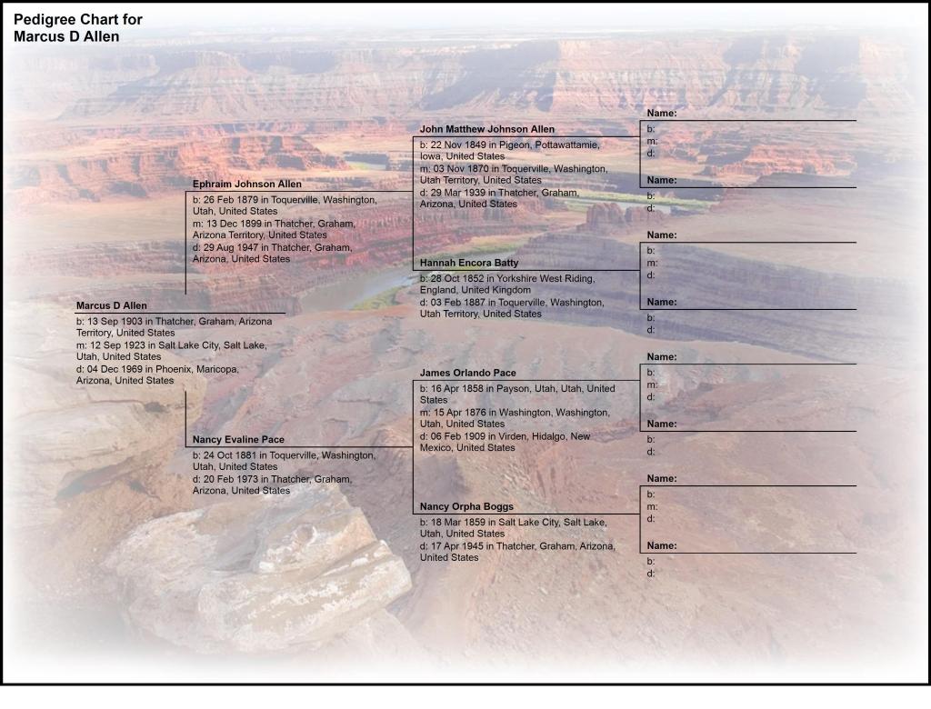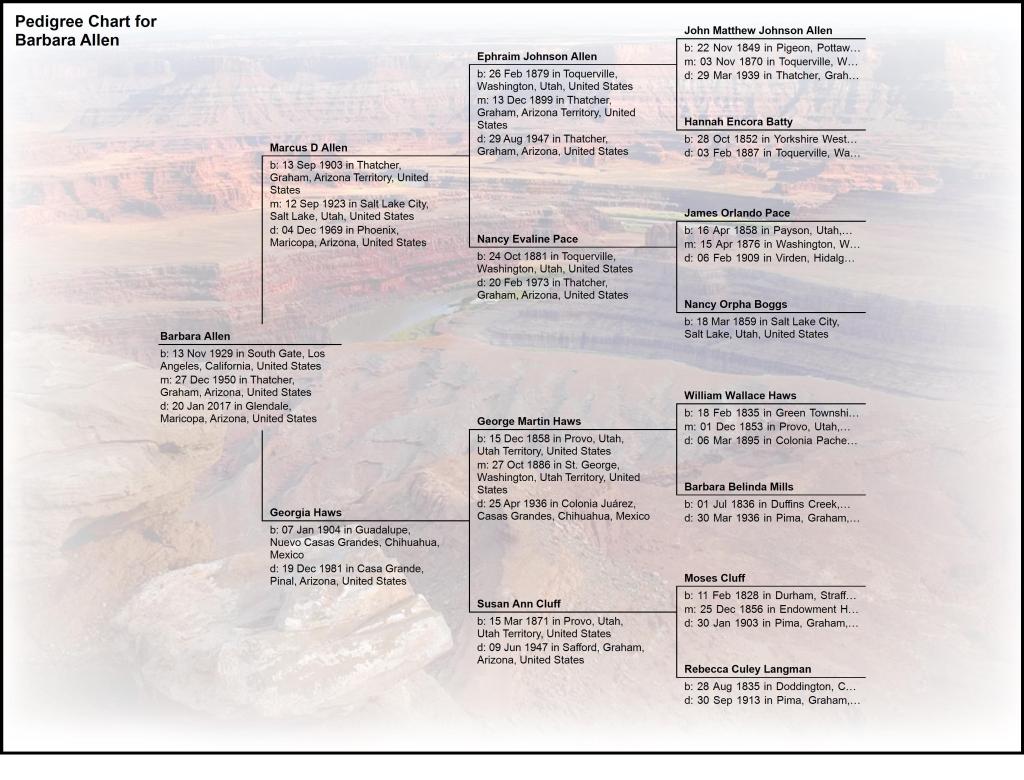 Barbara Allen’s parents were Marcus D. Allen and Georgia Haws. Marcus was born September 13, 1903, in Thatcher, Arizona to Ephraim Johnson Allen and Nancy Evaline Pace, both born in Utah Territory. Georgia was born January 7, 1904, in Guadalupe, Mexico to George Martin Haws and Susan Ann Cluff, both born in Utah Territory.