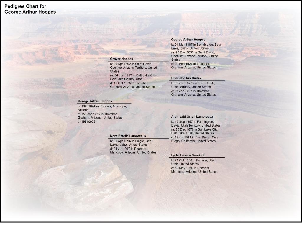 George Hoopes’ parents were Grover Hoopes and Nora Estelle Lamoreaux. Grover was born in St. David, Arizona Territory on April 20, 1892, to George Arthur Hoopes and Charlotte Iris Curtis, born in Idaho and Utah Territory, respectively. Nora Lamoreaux was born April 1, 1894, in Dingle, Idaho to Archibald Lamoreaux and Lydia Crockett, both born in Utah Territory.