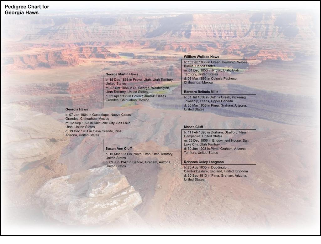 Georgia Haws was born January 7, 1904, in Guadalupe, Mexico to George Martin Haws and Susan Ann Cluff. Her father was in Mexico to establish a Mormon polygamist colony and practiced polygamy in accordance with church policy. Georgia’s mother Susan was his second wife. His first wife was Josephine Cluff, Susan’s sister. Georgia remembered her father’s third wife Martha Henrietta (Etta) Wall fondly, referring to her as her second mother. Georgia lived a brief time in Mexico before the family relocated to Pima, Arizona when she was a young child. Their branch of the family returned to Juarez in 1910 but then left Mexico permanently in 1912. They moved between Mesa, Gilbert, and Thatcher before eventually settling in Pima, Arizona in 1921.
