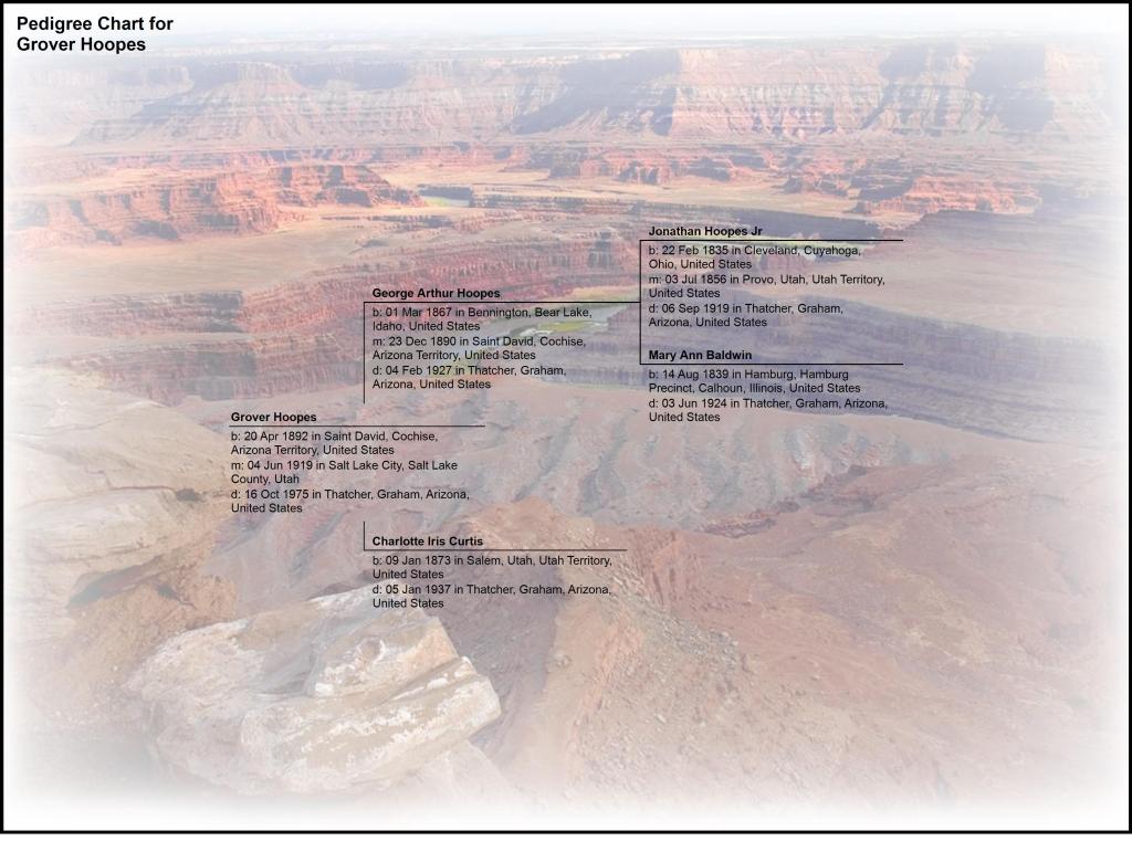Grover Hoopes completed high school at Gila Academy in Thatcher, Arizona. After a 3-year mission in the Pacific NW building and repairing LDS churches, he returned to Thatcher and in 1919 married Nora Lamoreaux, with whom he had been corresponding.